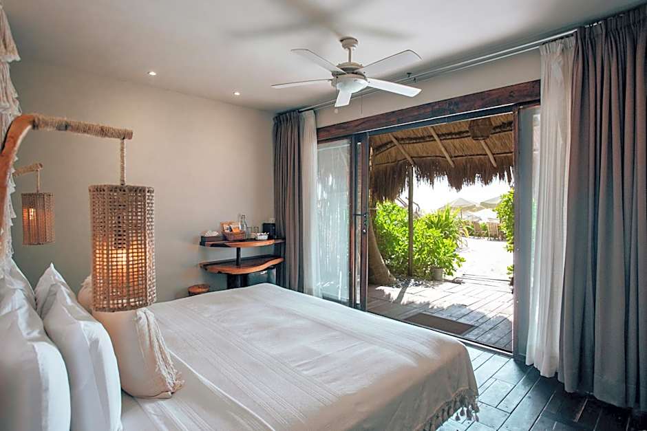 This two-level suite is located just a few yards away from the beach. The plunge pool is located on the second level and there are 2 sunbeds. It also features a portable speaker, coffee machine, mini-fridge, safety box and bathrooms amenities.